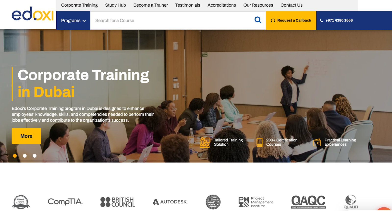 Program Customisation: Edoxi’s corporate training programs are tailored to each company’s goals and employee needs. They follow a clear five-step process: identifying training needs, creating customised content, delivering training in the classroom, online, or on-site, engaging participants interactively, and evaluating the results.